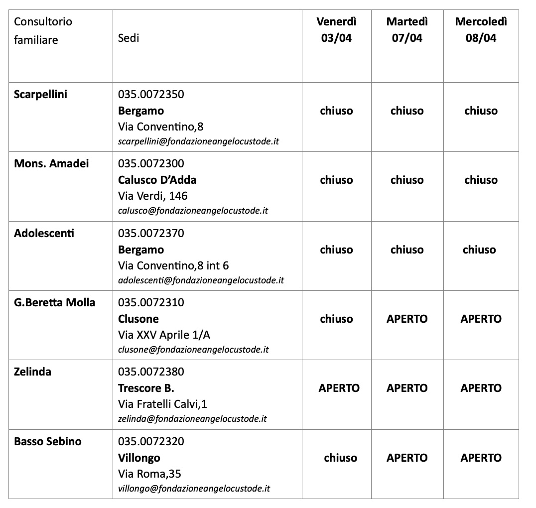 Durante il periodo pasquale i consultori familiari della Fondazione Angelo Custode hanno programmato le aperture in modo tale che i cittadini possano sempre contattare uno dei consultori: assicurando la continuità assistenziale, la modalità di tracciamento delle urgenze alle quali dare risposta e dirottando le richieste ai servizi più appropriati.